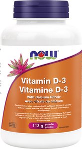 NOW® Vitamin D-3 Powder supplies this key vitamin along with Calcium Citrate to further support bone health. Powder format allows for controlled dosing and can be mixed with your favourite foods or beverages.